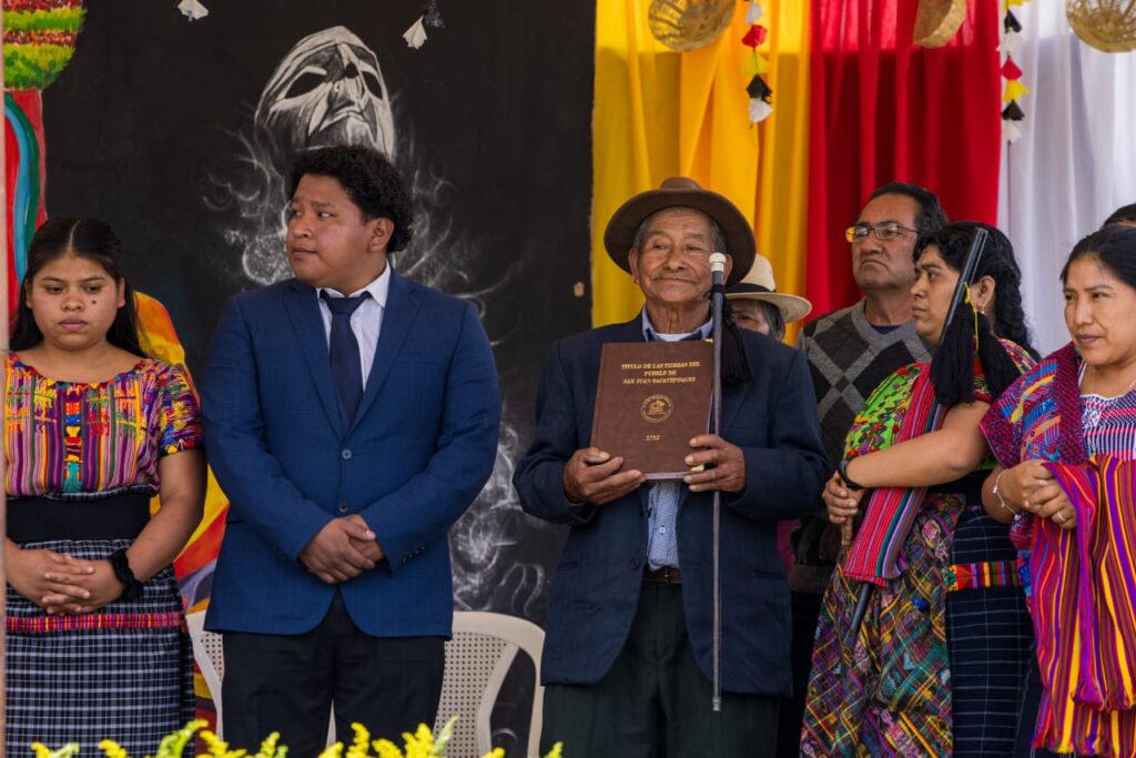 “Hablar del título histórico, es hablar de la unidad comunitaria, la autoridad ancestral y la defensa de la vida. Nos invita a valorar nuestras costumbres, idioma, ceremonias y cosmovisión que nos enseña a ver la tierra como madre, y no como mercancía”, expresó Maximiliano Pirir, representante del pueblo originario de San Juan Sacatepéquez.