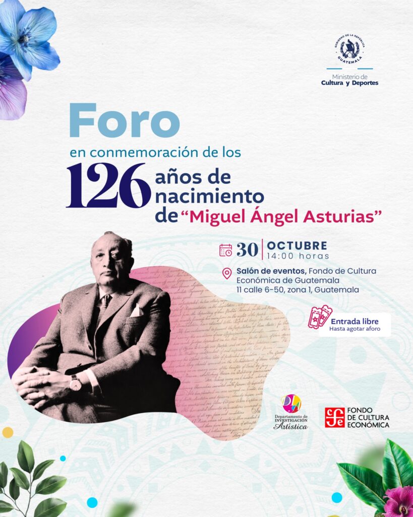 El Ministerio de Cultura y Deportes te invita a asistir a este foro que conmemora los 126 años de nacimiento del premio Nobel de Literatura guatemalteco, Miguel Ángel Asturias. Es el 30 de octubre a las 14 horas en el salón de eventos, Fondo de Cultura Económica de Guatemala (11 calle 6-50, zona 1, Ciudad de Guatemala).