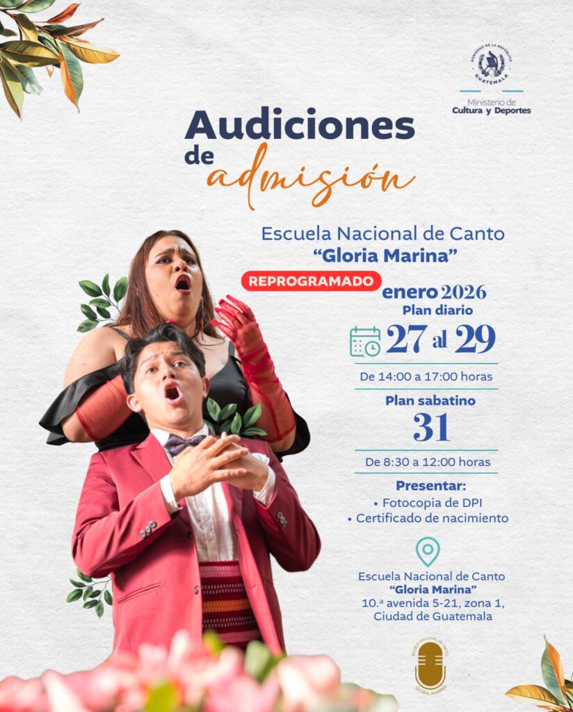 Atención amantes del arte! La Escuela Nacional de Canto “Gloria Marina” ha reprogramado sus audiciones. Queremos asegurarnos de escuchar tu talento, por lo que te invitamos a participar en estas nuevas fechas de admisión para el ciclo 2026.