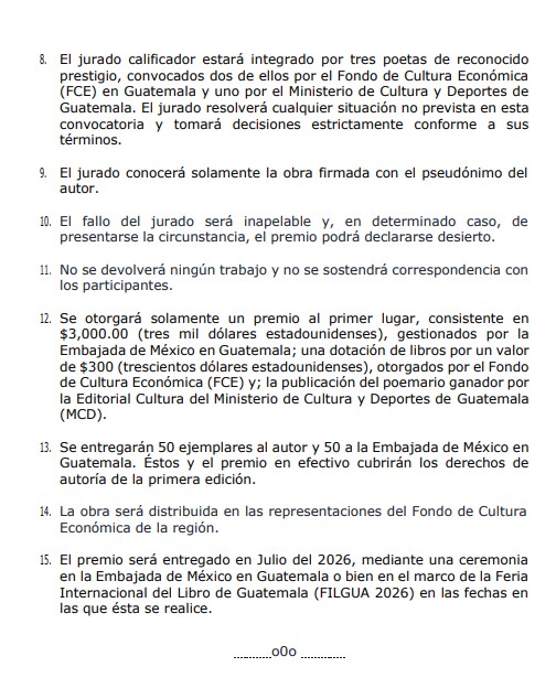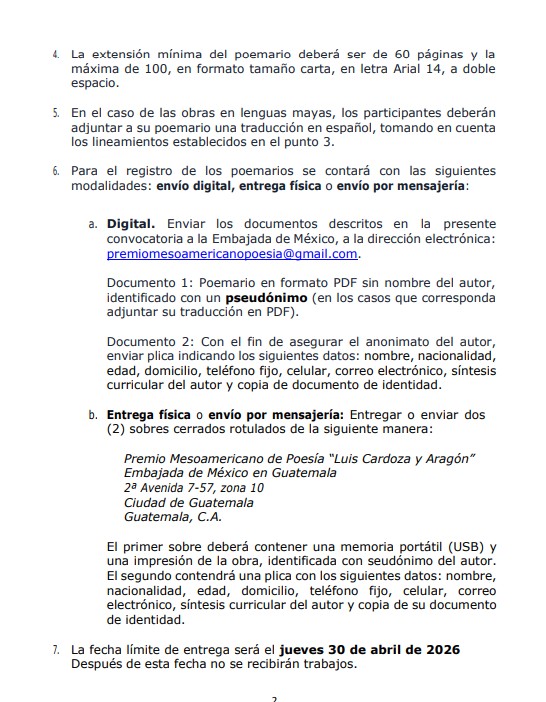 Esta cartera en trabajo conjunto con la Embajada de México en Guatemala y el Fondo de Cultura Económica (FCE) de Centroamérica y el Caribe, invita a poetas de la región a postularse para el XX Premio Mesoamericano de Poesía «Luis Cardoza y Aragón» 2026.