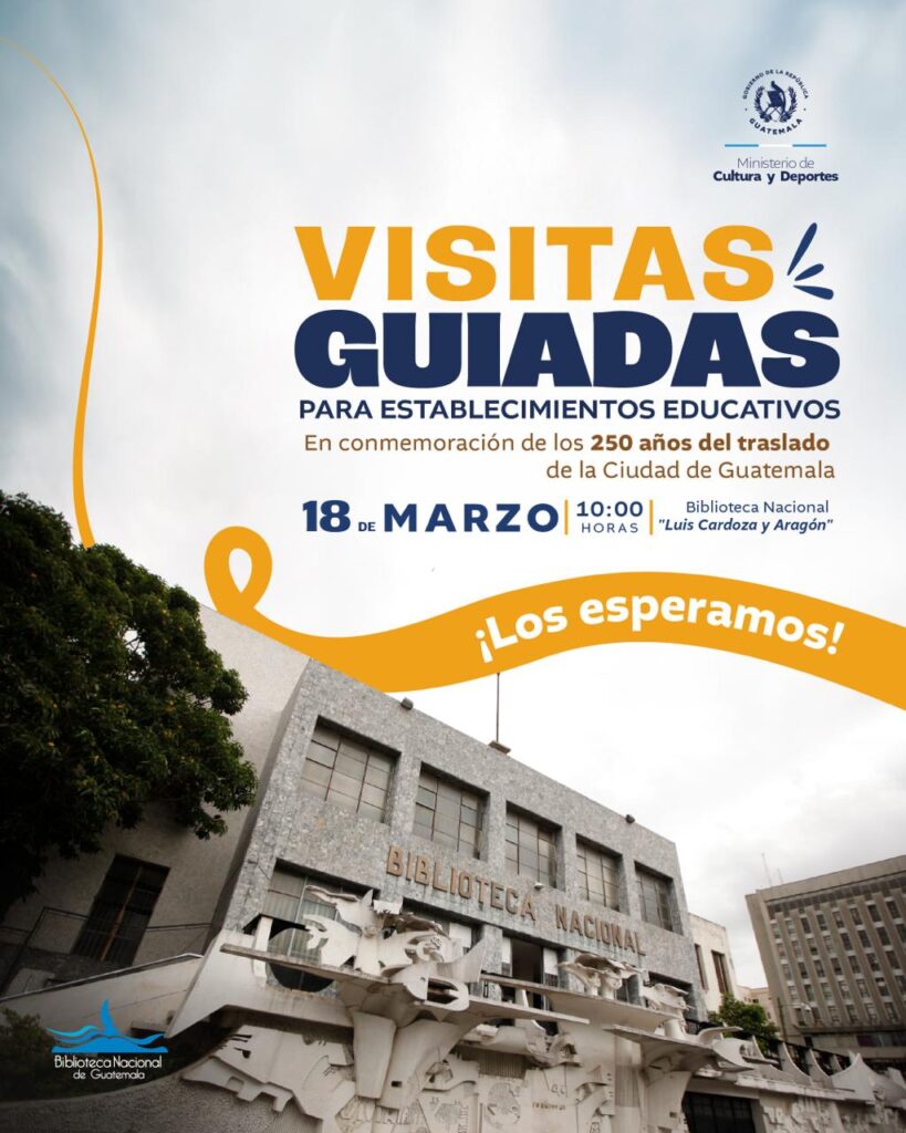 Invitamos a establecimientos educativos a participar en las visitas guiadas en la Biblioteca Nacional “Luis Cardoza y Aragón”, en el marco de la conmemoración de los 250 años del traslado de la Ciudad de Guatemala.