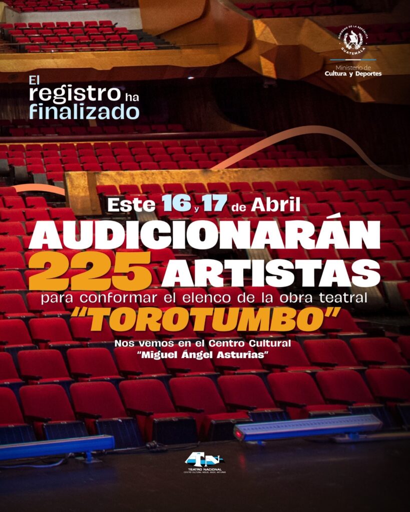 Cerramos un capítulo y abrimos el escenario con 225 artistas dispuestos a conformar el elenco de la obra “Torotumbo”. A partir de este 16 de abril, el Centro Cultural “Miguel Ángel Asturias” será el espacio de una audición sin precedentes.