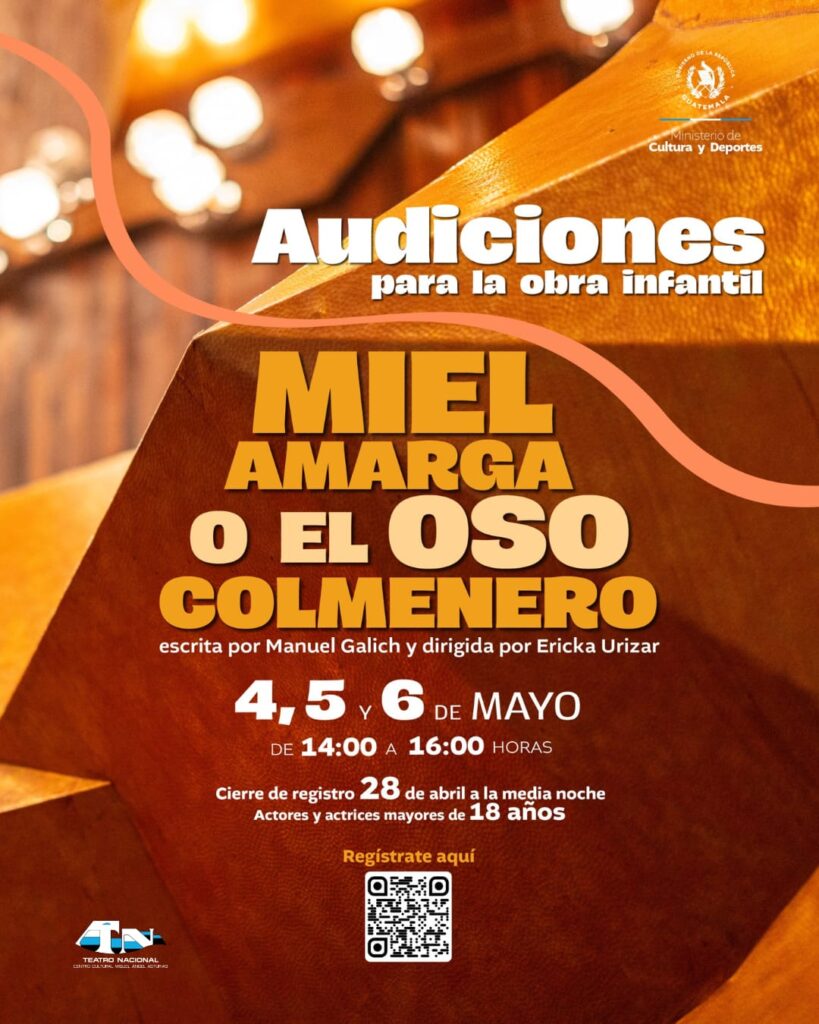 El Centro Cultural “Miguel Ángel Asturias” te invita a participar en las audiciones para la obra de teatro infantil “Miel amarga o el oso colmenero”, escrita por Manuel Galich y dirigida por Ericka Urízar.